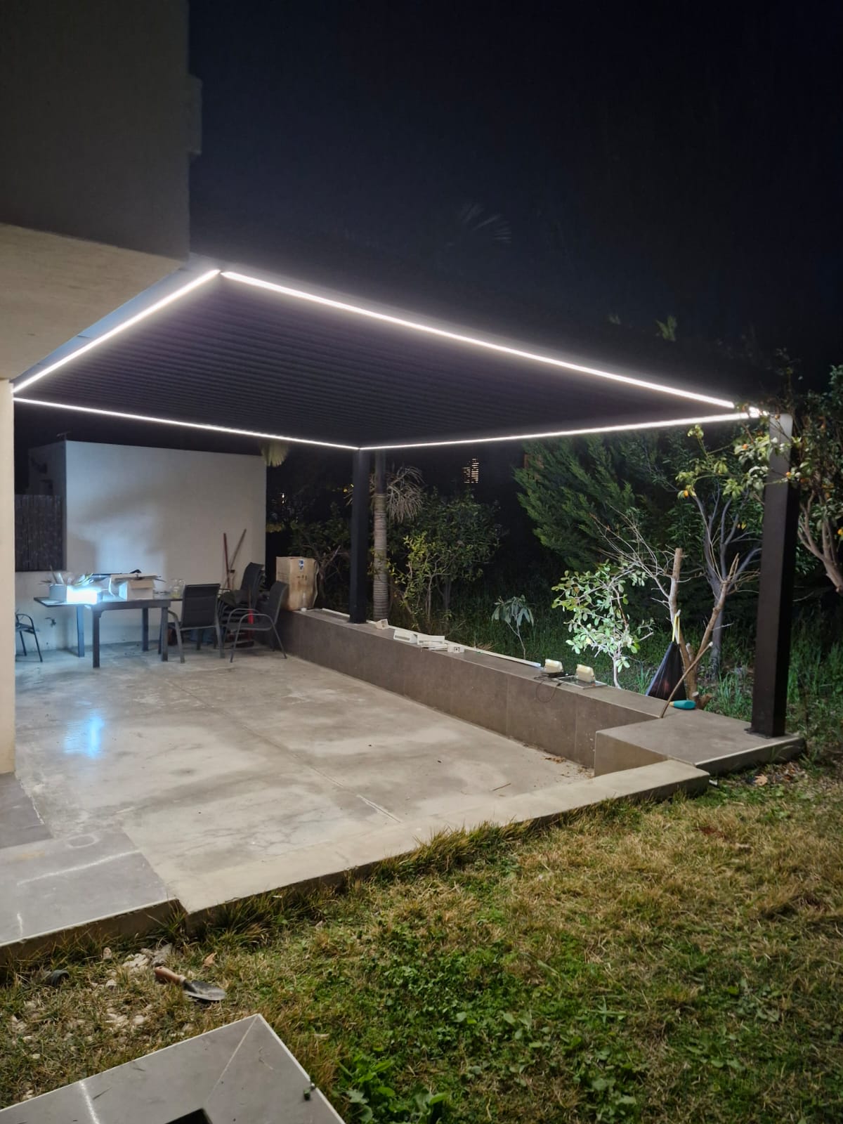 - מערכת ניקוז חכמה נסתרת – הפרגולה מצוידת במרזב היקפי אינטגרלי בעל קיבולת מים גבוהה, המנקז את המים ישירות דרך העמודים. פתרון זה שומר על סביבה יבשה ועל מראה נקי ואסתטי, ללא צנרת חיצונית גלויה.