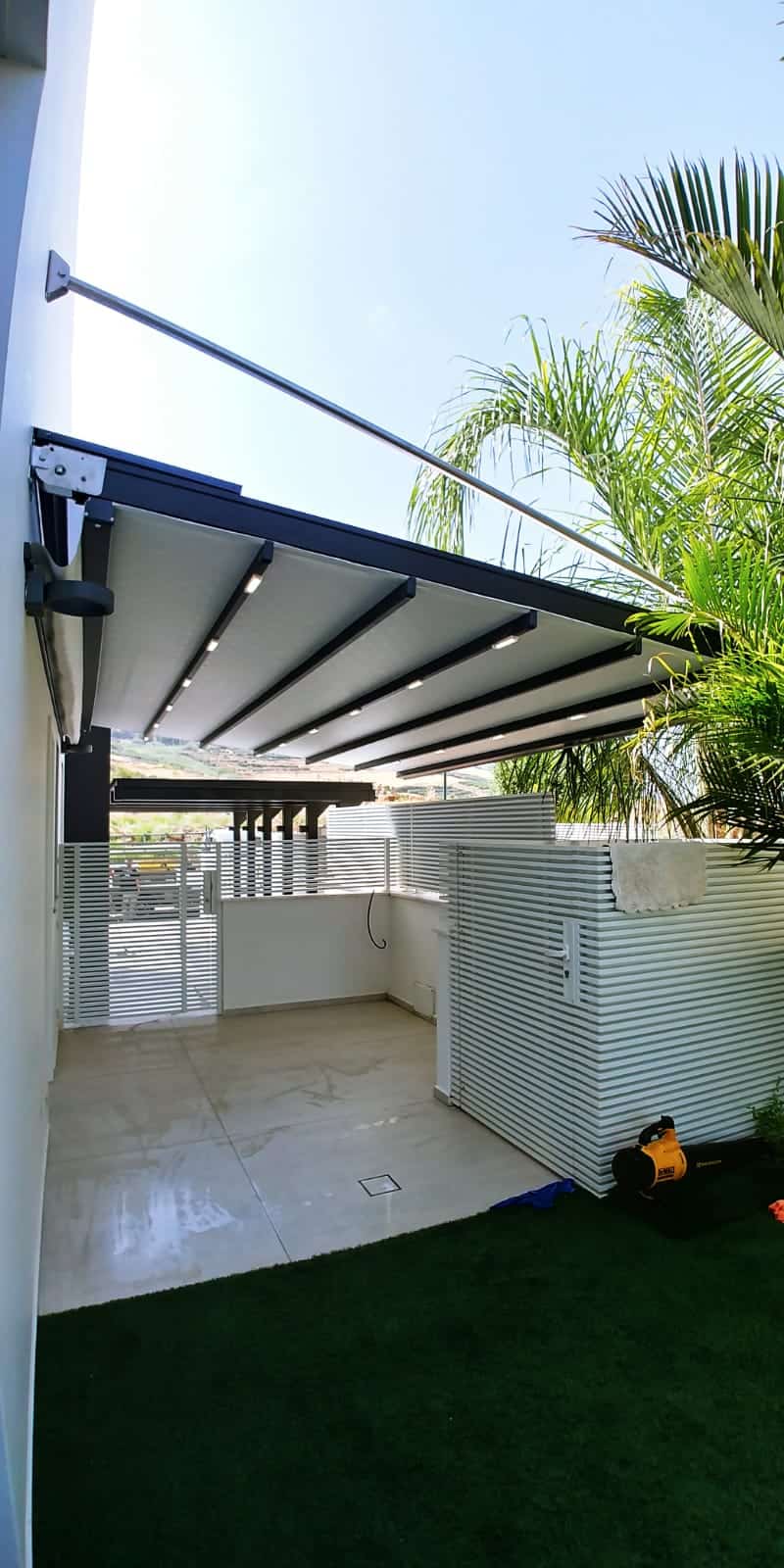 - עיצוב נקי ואסתטי – היריעה נגללת לתוך “קסטה” או נאספת בצורה גלית, מה שמעניק למרפסת מראה מודרני ויוקרתי.